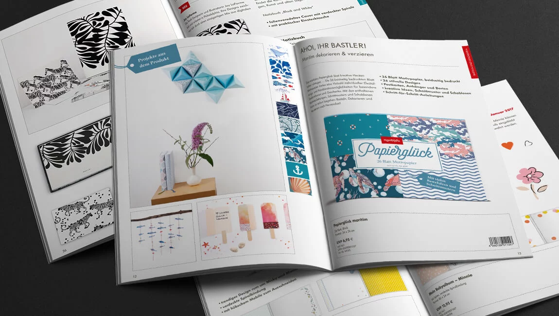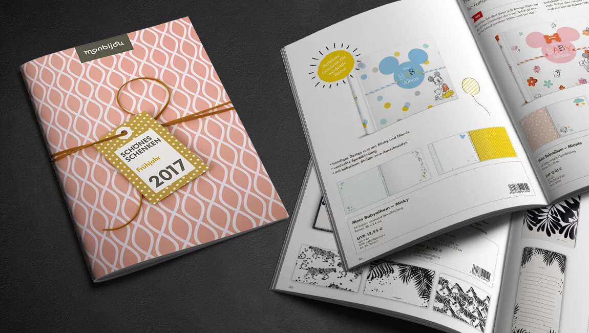 Layout, Satz und Reinzeichnung des monbijou-Katalogs „Schönes Schenken“ für das Frühjahr 2017.