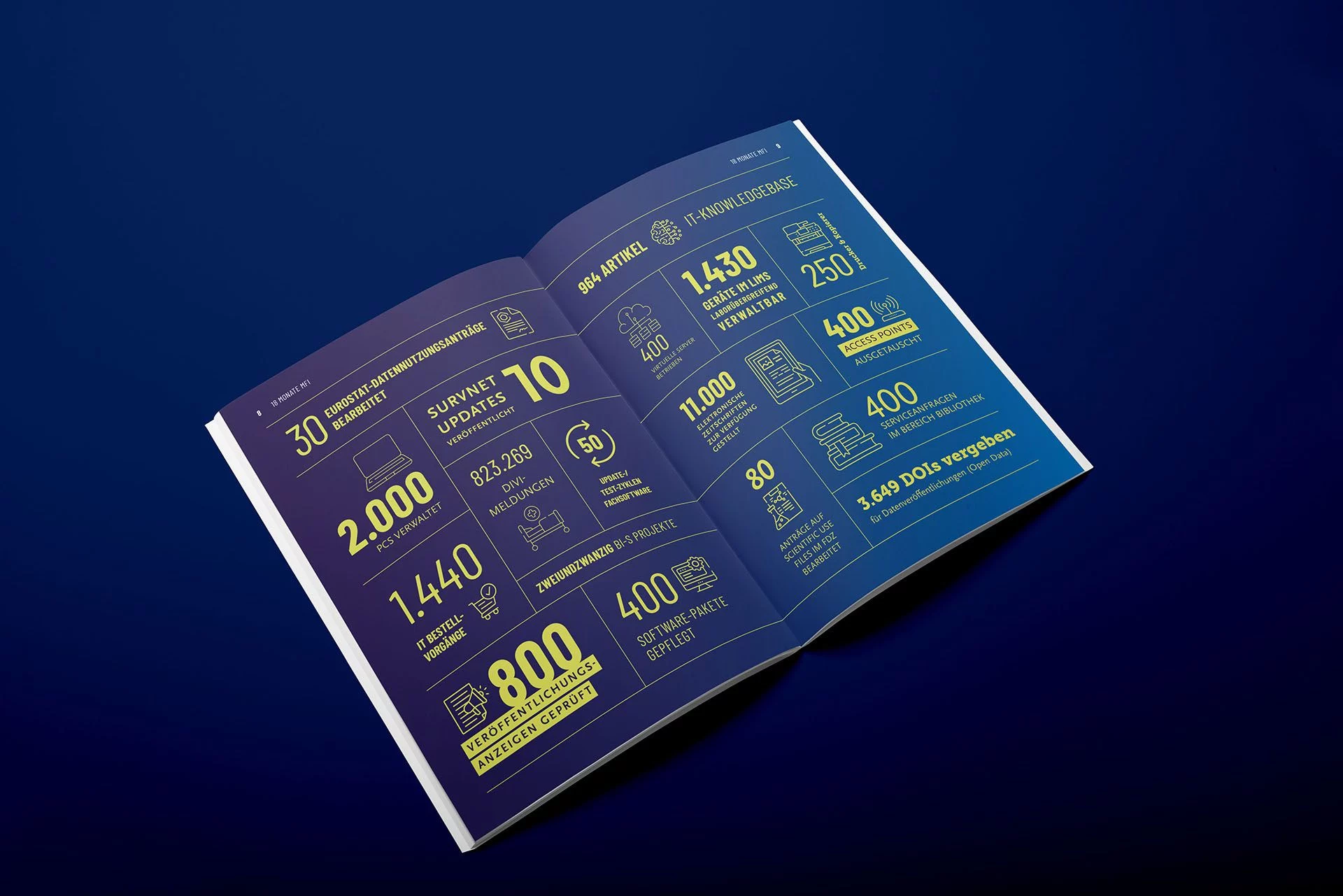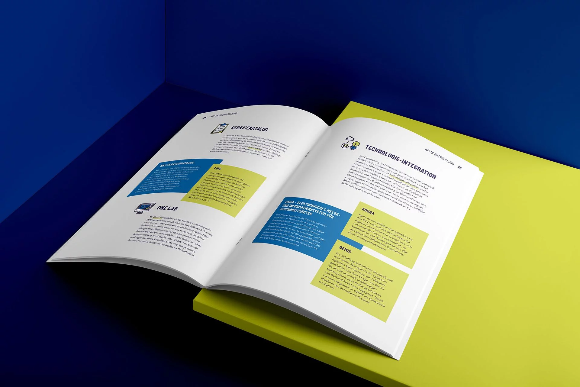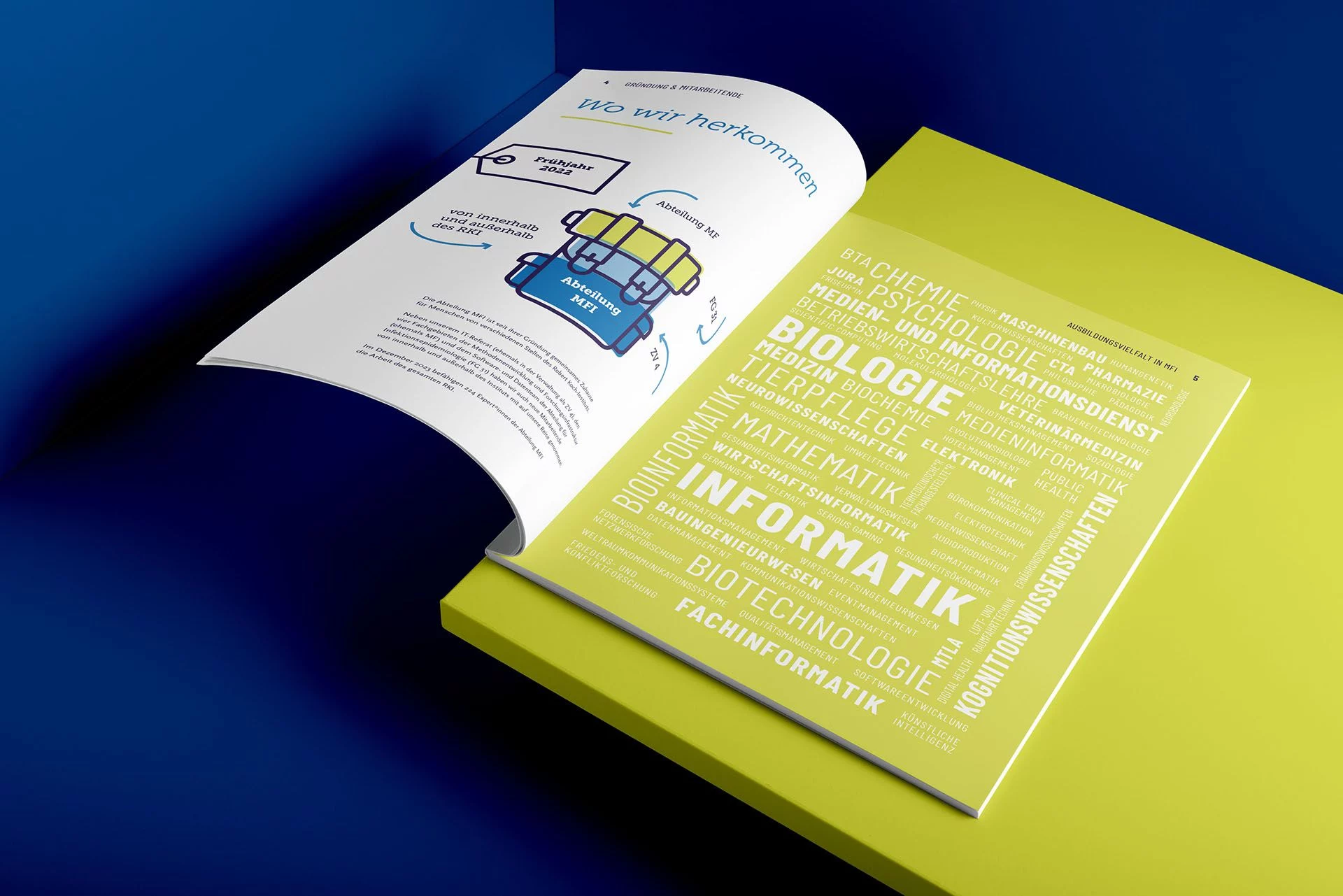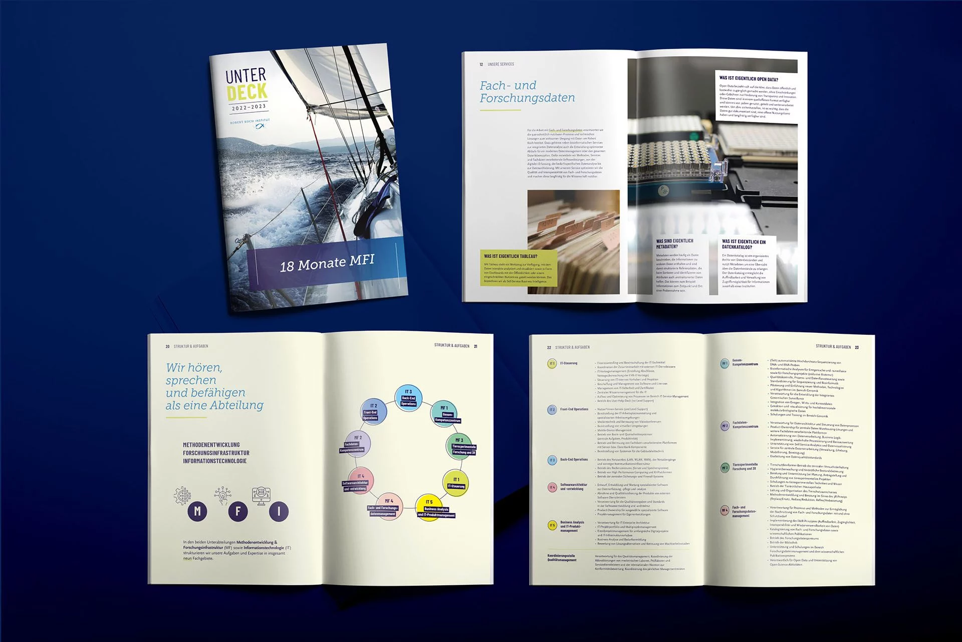 Die Abteilung MFI (Methodenentwicklung, Forschungsinfrastruktur und Informationstechnologie) im Robert-Koch-Institut hat nach eineinhalb Jahren Bestehen ihre erste Broschüre „MFI unter Deck“ veröffentlicht. Mitarbeiter*innen des RKI, der Abteilung selbst und externe Partnerorganisationen, ausgewählte interessierte Gäste oder Außenstehende sollten mit der Broschüre abgeholt werden. Es galt ein ansprechendes Layout zu schaffen, gepaart mit modernen Infografiken, fachspezifischen Bildelementen und ausdrucksstarken Fotos.